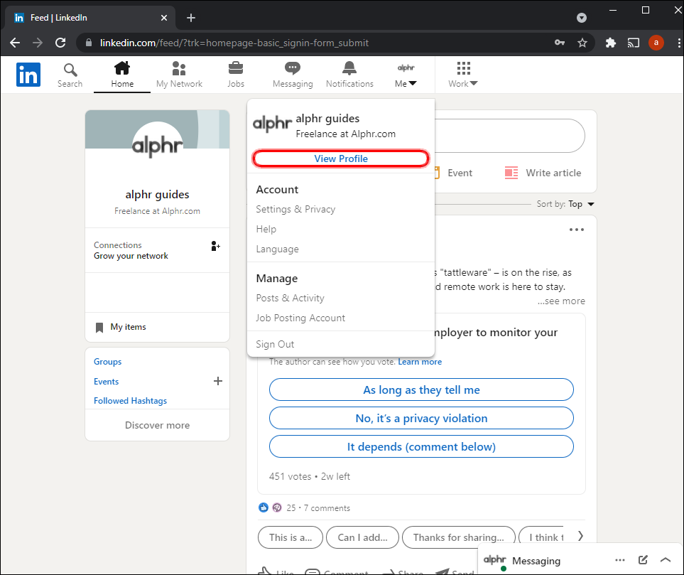 To enable Open To Work from your LinkedIn profile click the Me icon at the top of your screen.